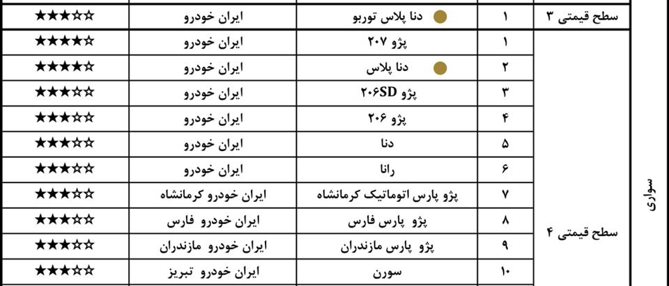 با توجه به اطلاعات ارسالی، دنا پلاس توربو تنها خودروی در رده قیمتی 3 است و فقط 3 ستاره در معیار کیفیت کسب کرده است. در عوض، در رده قیمتی 4، هر دو نسخه دنا پلاس توربو و معمولی دارای 4 ستاره در معیار کیفیت هستند.