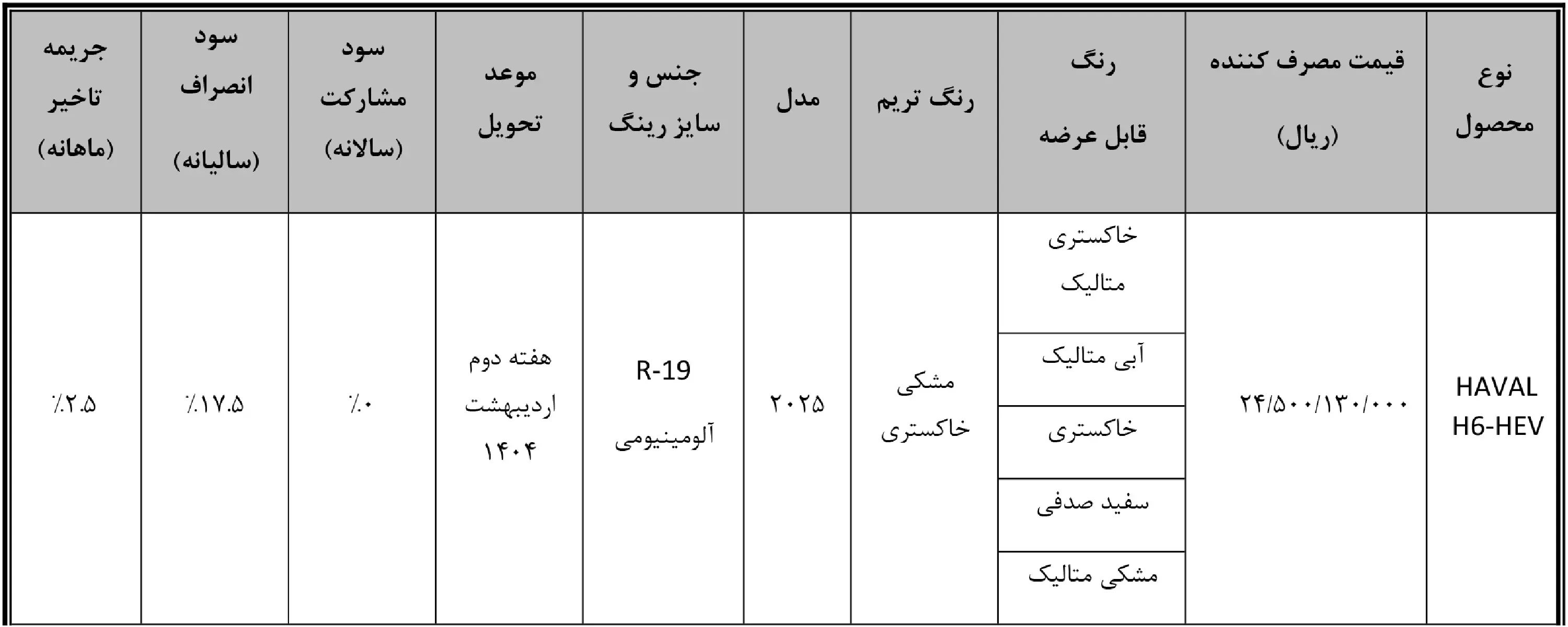 متقاضیان خرید خودروی هاوال H6 میتوانند از ساعت ۱۰ صبح روز دوشنبه، ۶ اسفند ۱۴۰۳، نسبت به ثبت درخواست خرید خود از طریق سامانه bahman.iranecar.com/bmcars اقدام کنند. این پیشثبتنام حداکثر تا پایان روز سهشنبه، ۷ اسفند ۱۴۰۳، ادامه خواهد داشت.