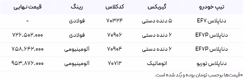 - قیمت دناپلاس EF7 با گیربکس ۵ دنده دستی در این جدول ذکر نشده است.