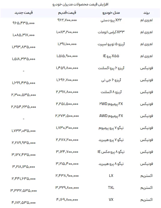 جدول تغییر قیمت محصولات مدیران خودرو (اعمال شده از ۱۹ فروردین ۱۴۰۴)