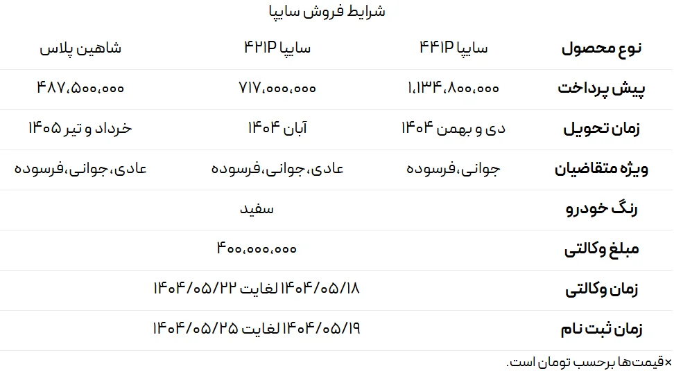 ثبت نام پیشفروش اینترنتی محصولات سایپا، از ساعت ۱۰ صبح روز سهشنبه، مورخ ۱۴۰۴/۰۵/۱۴ آغاز شد و تا تکمیل ظرفیت ادامه دارد. این طرح شامل خودروهایی مثل ساینا S، کوییک GXL و سایر مدلهاست.