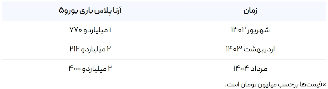 آخرین قیمت شرکت ایران خودرو دیزل برای کامیونت آرنا پلاس، در جدول زیر آمده است: