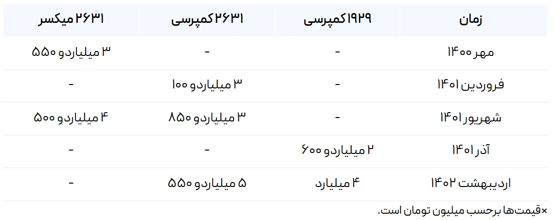 آخرین قیمت شرکت ارس خودرو دیزل برای قیمت آمیکو 2631 و قیمت آمیکو 1929 در جدول زیر آمده است:
