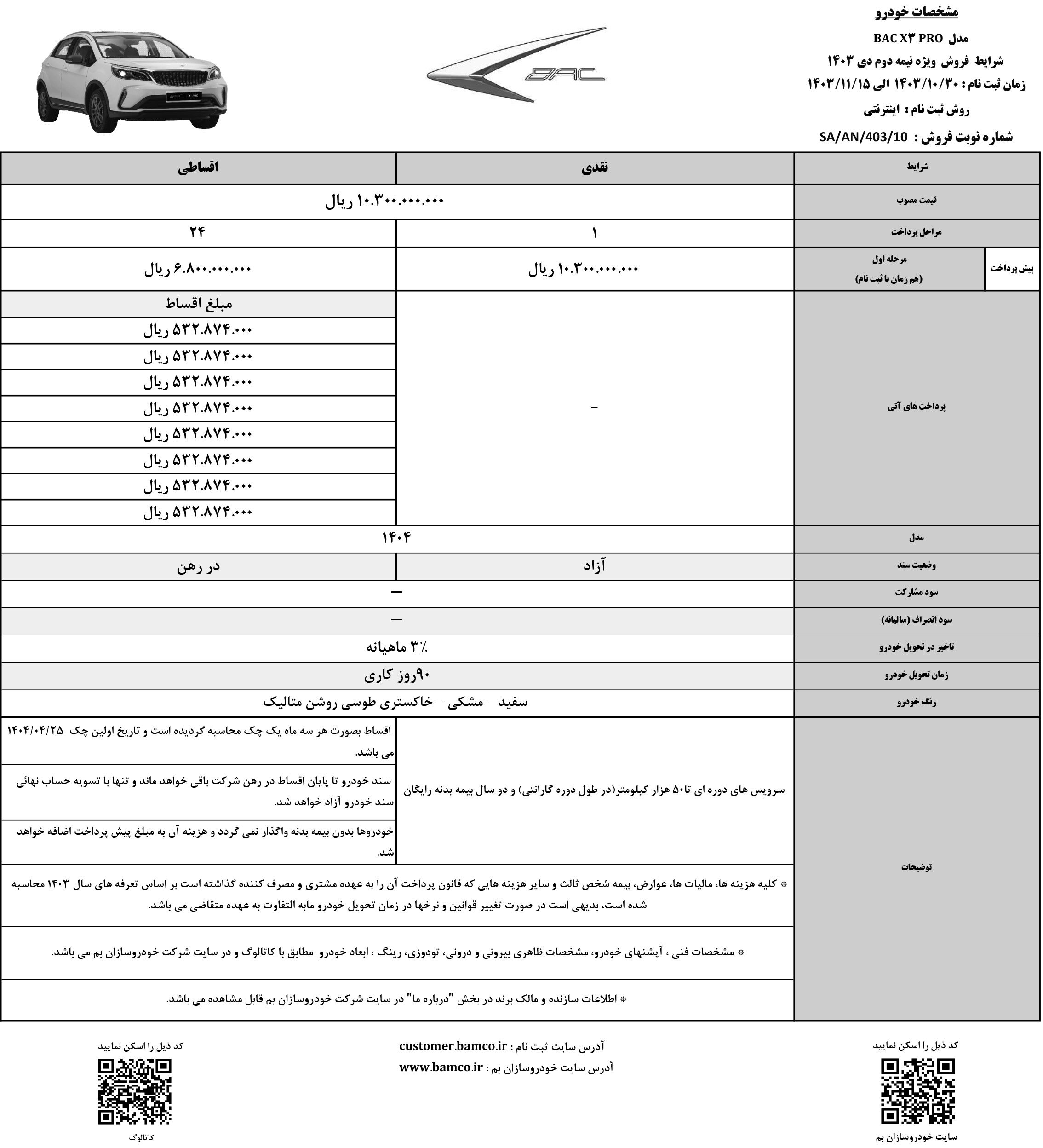 فرایند ثبت نام برای خرید خودرو بی‌ای‌سی از روز یکشنبه، 29 مهر 1403 آغاز می‌شود و به مدت یک هفته ادامه خواهد یافت. در این مرحله از فروش نقدی توسط شرکت خودروسازان بم، متقاضیان می‌توانند مدل X3 PRO را تنها به صورت نقدی و با قیمت نهایی خریداری کنند: