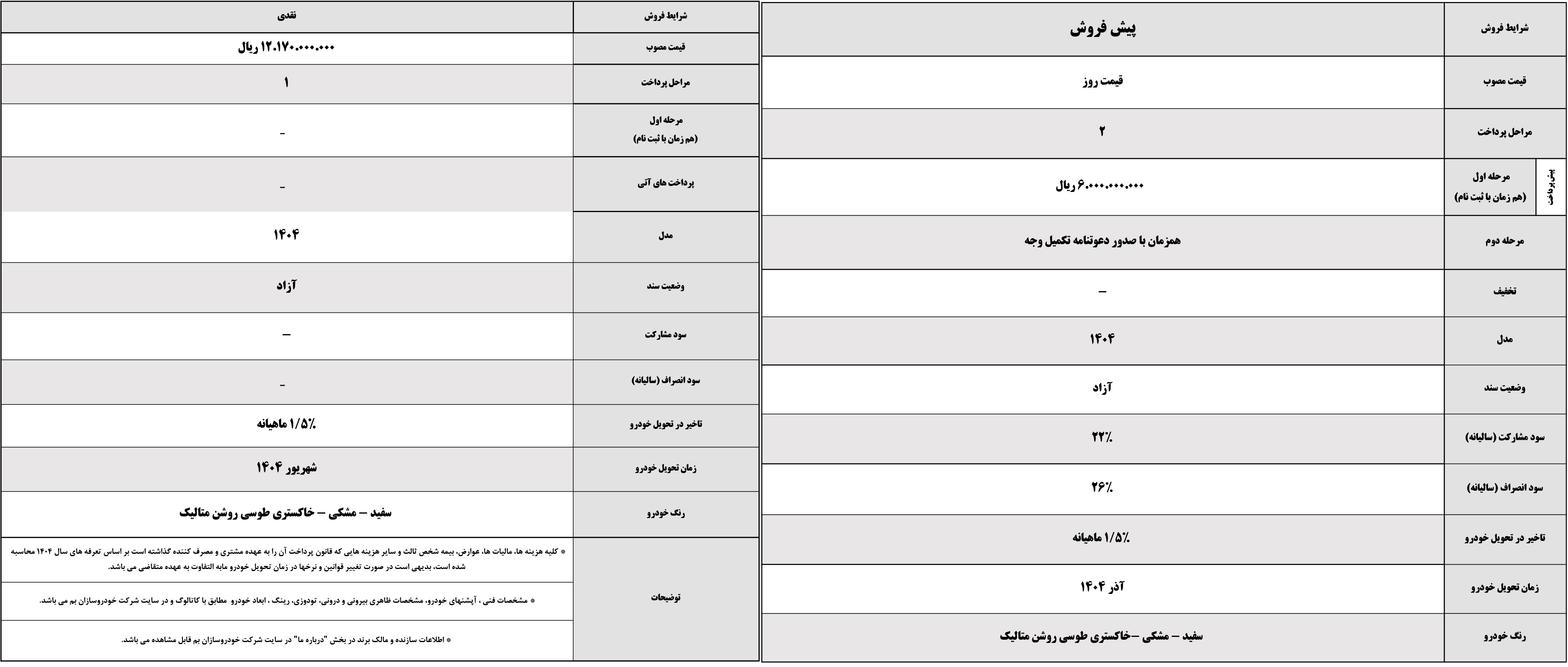 طبق بخشنامه جدید فروش نقدی و اقساطی BAC، خریداران می‌توانند خودروها را در چهار رنگ جذاب سفید، مشکی، خاکستری و طوسی انتخاب نمایند. برای کسب اطلاعات بیشتر، لطفاً به لینک زیر مراجعه کنید: