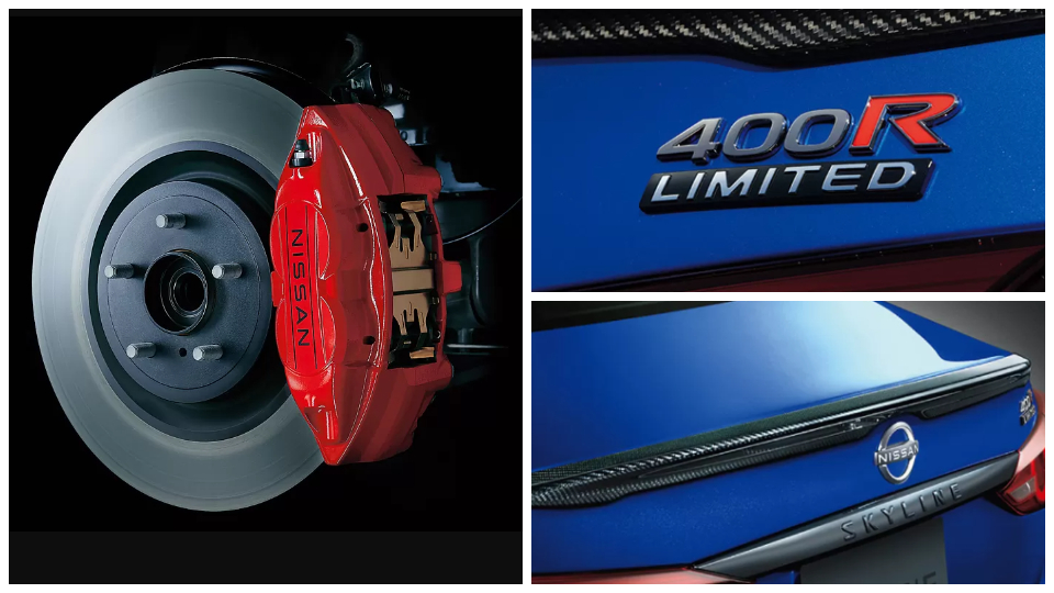مدل خاص نیسان اسکای لاین 400R لیمیتد در تعداد محدود 400 دستگاه روانه بازار خواهد شد. این خودرو با آینه‌های جانبی و باله لبه صندوق از جنس فیبر کربن، و رینگ‌های آلومینیومی 19 اینچی که به تایرهای اسپرت Maxx GT 600 تولید شده توسط دانلوپ مجهز شده است، عرضه می‌شود. همچنین، نشان 400R لیمیتد با حرف R به رنگ قرمز به زیبایی بر روی در صندوق خودرو قرار دارد.