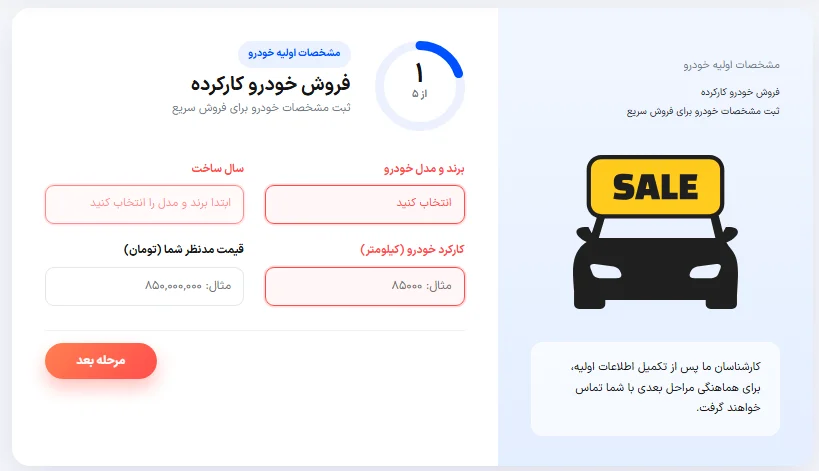 - اگر قصد فروش خودرو دارید، تنها کافیست وارد بخش فروش خودرو شوید و مشخصات پایه مانند مدل، سال تولید، کارکرد و چند عکس واضح را بارگذاری کنید.