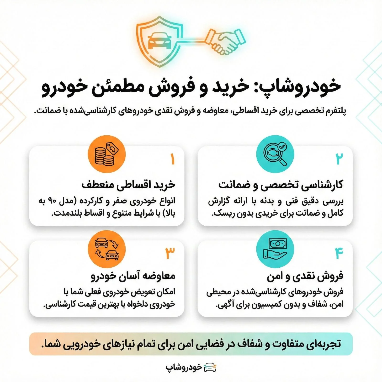 خودروشاپ تنها جاییه که قبل از هر چیز خودش پا میذاره وسط؛ میره سراغ خودروهای کارکرده مدل ۹۰ به بالا، کارشناسی فنی و بدنهی کامل انجام میده و فقط ماشینهایی رو که از فیلتر سختگیرانه تأیید فنی رد میشن، با ضمانت واقعی وارد نمایشگاه آنلاینش میکنه.