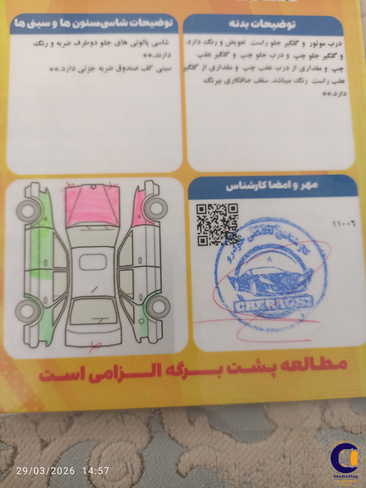 وضعیت موتور وضعیت بدنه وضعیت شاسی عقب وضعیت شاسی جلو