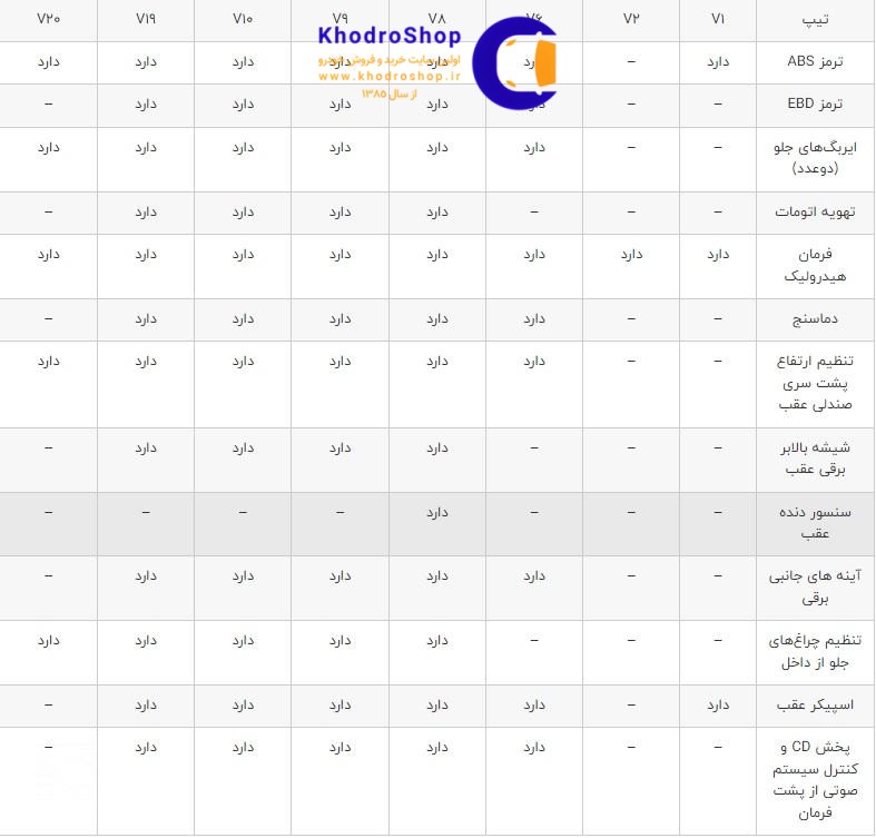به طور مثال، مدلهای V1 و V2 کیسههوای جلو ندارند. همچنین کولر اتوماتیک در مدلهای V1، V2، V6 و V20 موجود نیست.