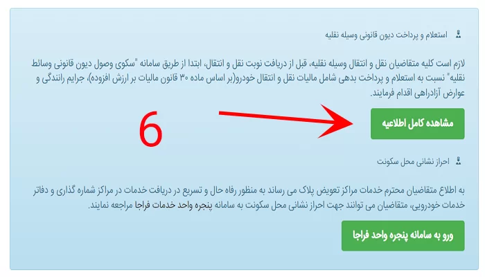 بعد از انتخاب مرکز تعویض پلاک مورد نظر، صفحه زیر برای شما باز می شود که مربوط به پرداخت مالیات اتومبیل می شود. برروی گزینه مشخص شده در تصویر زیر ضربه بزنید و مشخصات مورد نیاز را وارد کنید. در ادامه شما به صفحه پرداخت مالیات منتقل می شوید و بعد از پرداخت هزینه می توانید نوبت تعویض پلاک خود را دریافت نمایید. به این نکته توجه کنید که بعد از پرداخت مجددا به این صفحه ارجاع داده می شوید که باید مرحله هفتم را نیز ثبت کنید. اگر هزینه مالیات خودرو را پرداخت کرده باشید، جای نگرانی نیست سیستم به صورت اتوماتیک از این قسمت برای شما عبور خواهد کرد. کافیست که برروی گزینه سبز رنگ کلیک کنید.
